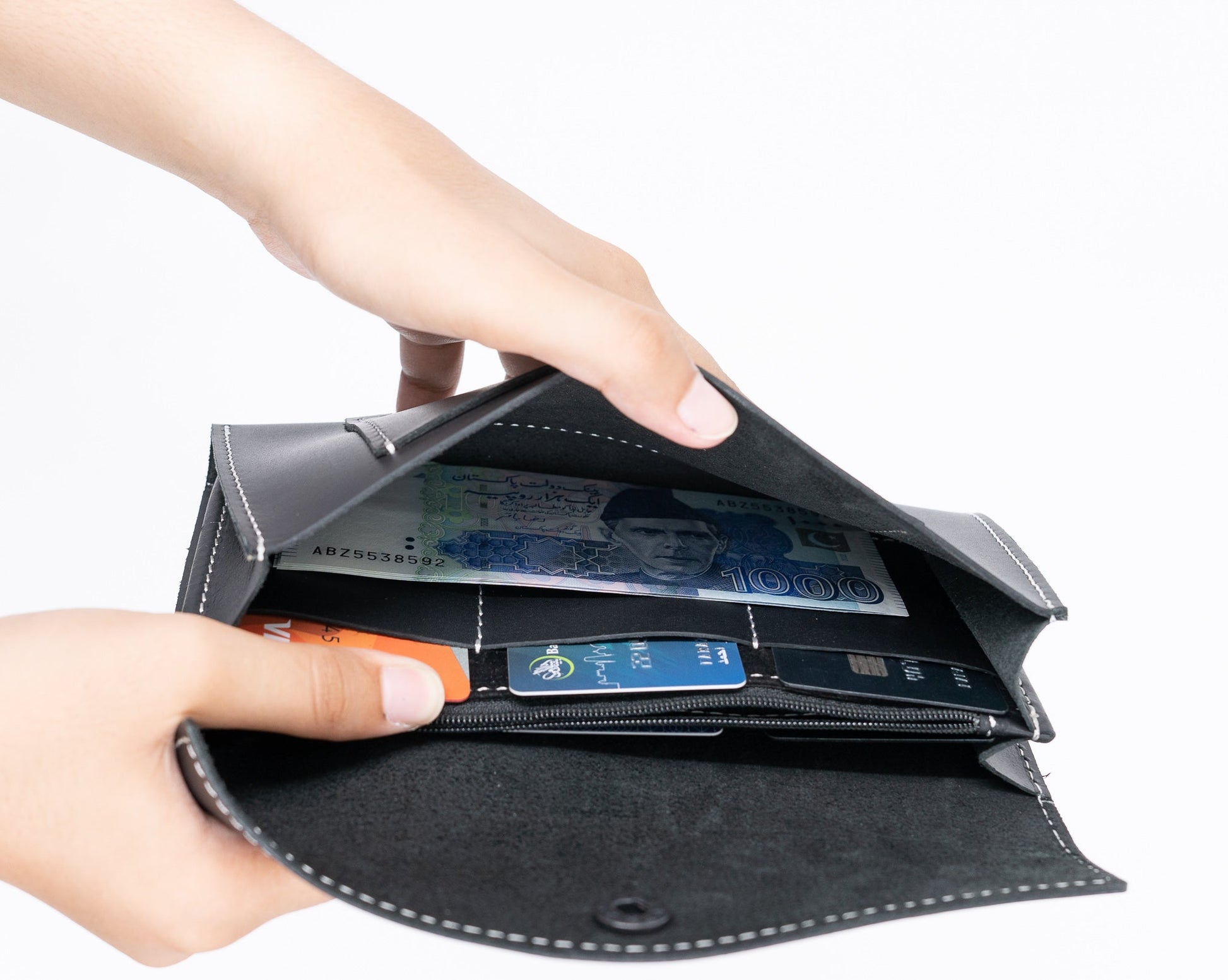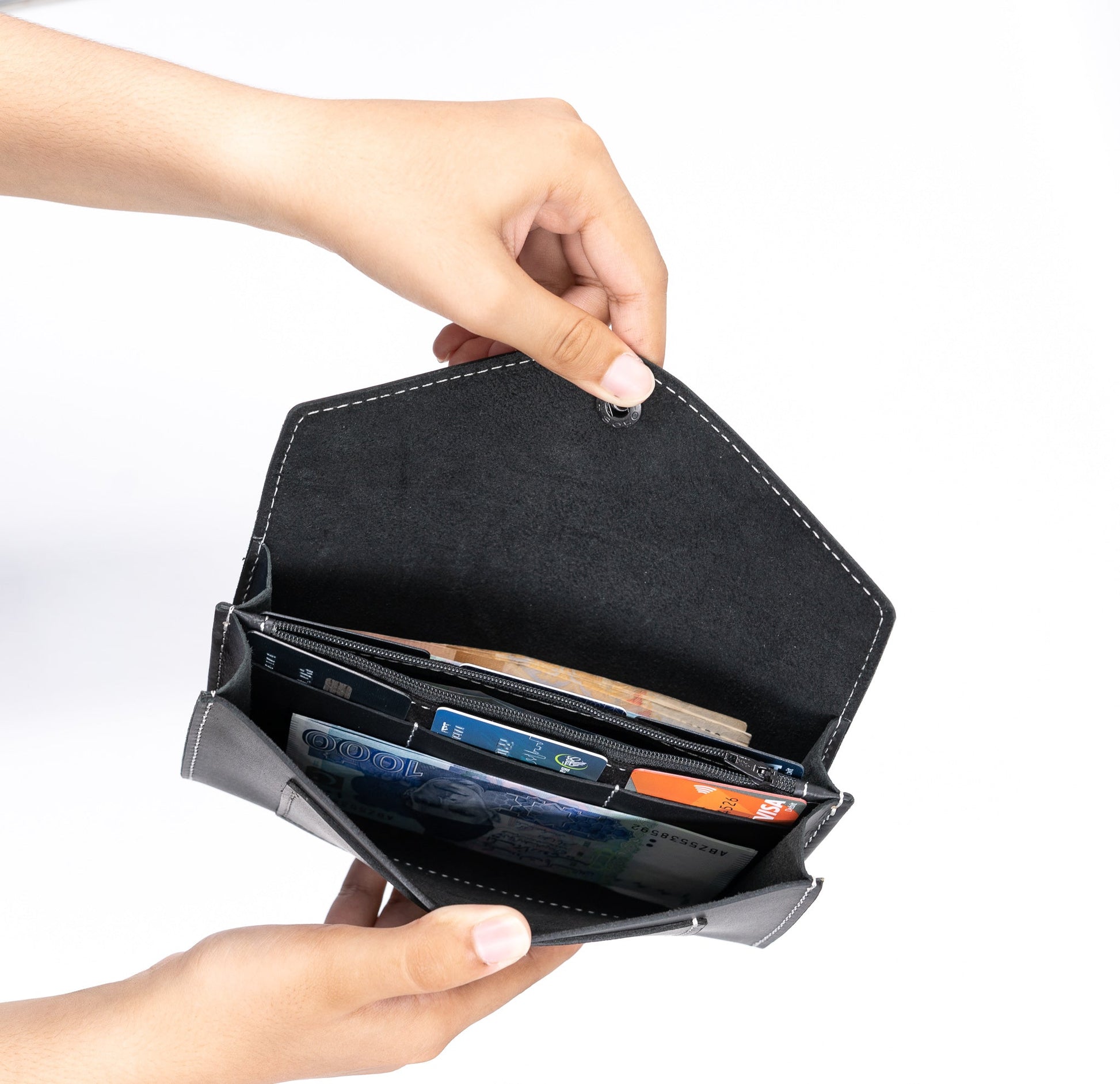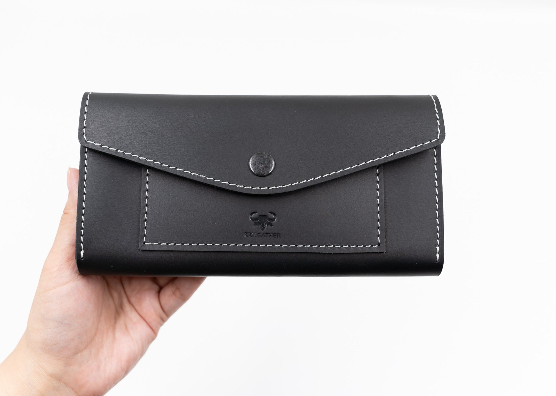 The Margarita Black Maker's Edition by Cordavio is a sophisticated accessory crafted for the modern woman who values both elegance and functionality. Handcrafted from the most premium full-grain leather, this clutch gracefully matures with use, developing a rich patina that tells its own story. Designed to complement both day and evening settings, it offers ample space for essentials while maintaining a sleek, minimalist profile. With each piece showcasing natural variations, the Margarita clutch is a unique and stylish companion, blending timeless style with practical elegance.